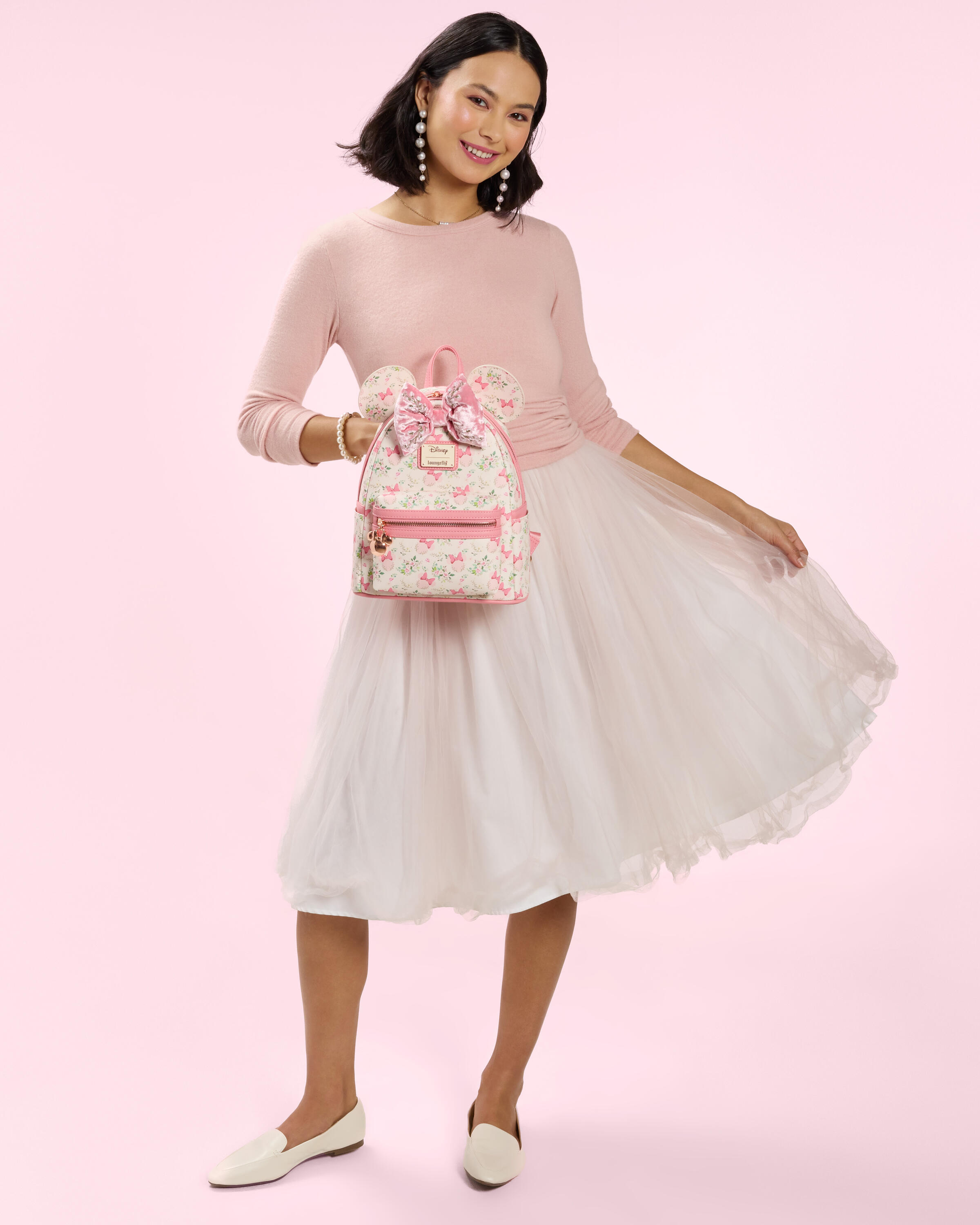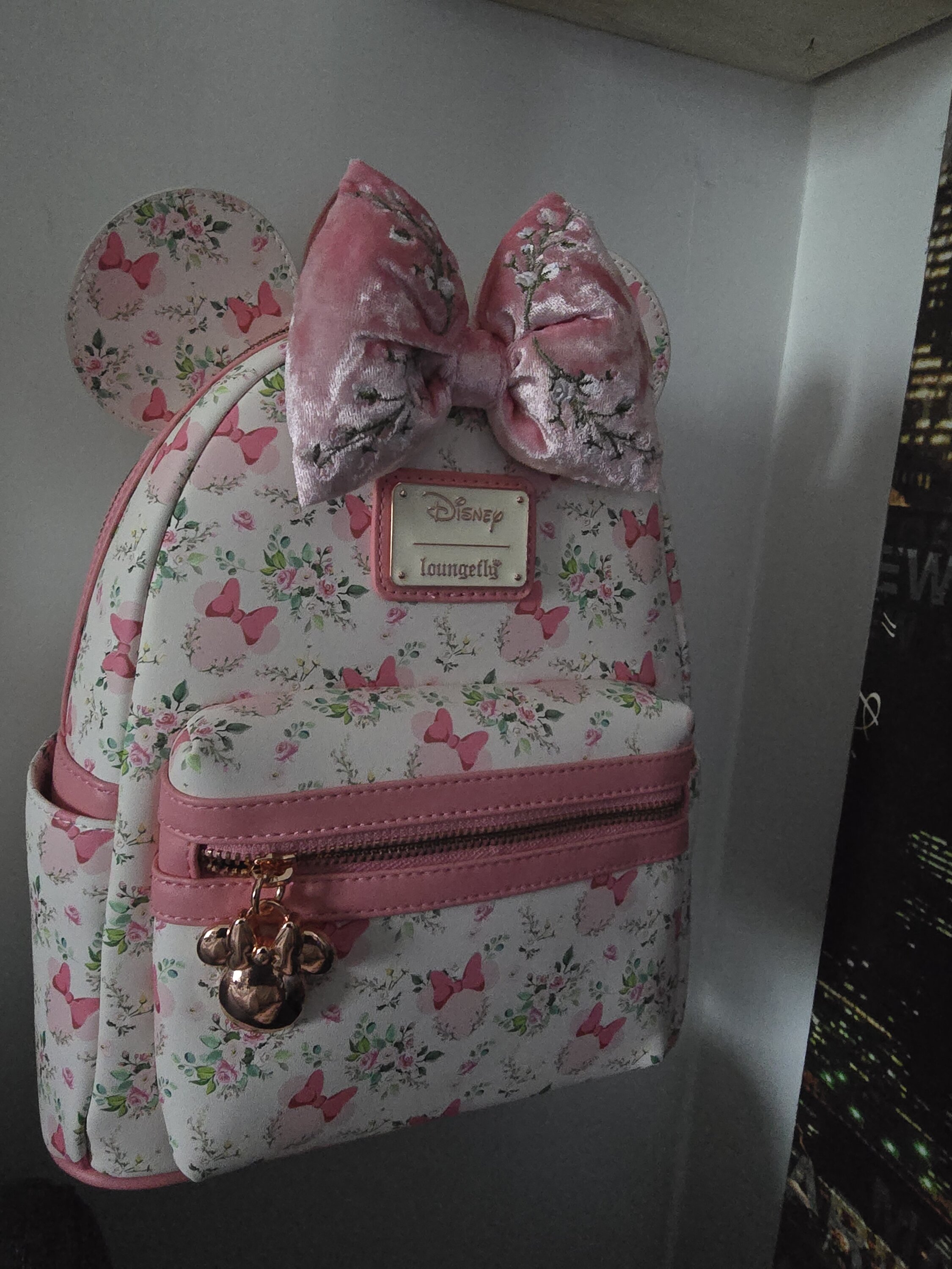 Deze mini rugzak is geïnspireerd op Disney's Minnie Muis! Je vindt er 3D-applicatieoren met een fluwelen strik ertussen. Over de hele rest van de tas vind je een herhalend patroon van Minnie Muis silhouetten, omringd door bloemen. Roze bandjes maken de look compleet.