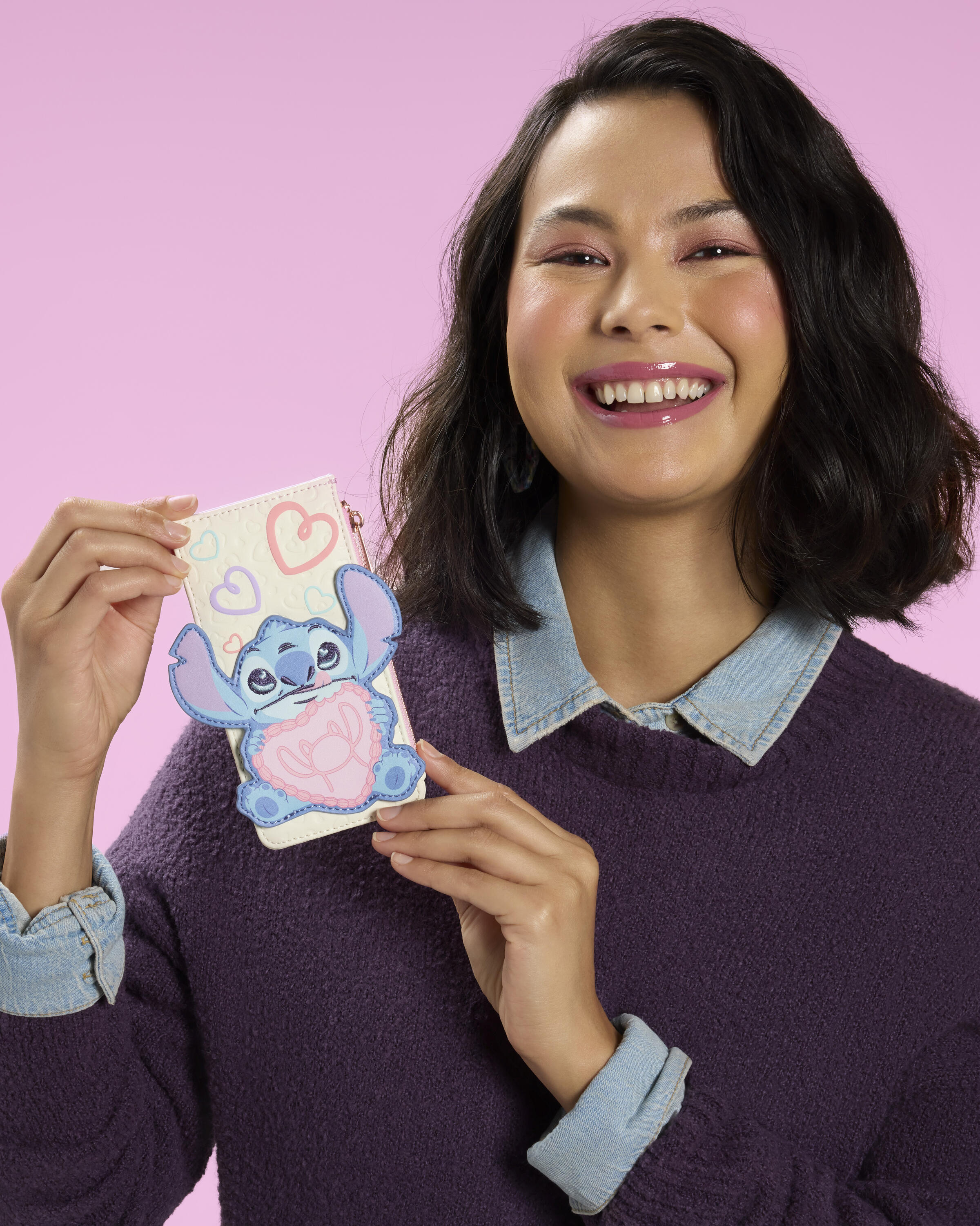 Maak je klaar voor Valentijnsdag met deze schattige Stitch pasjeshouder. Op de voorkant zie je Stitch met een hartvormige taart met het silhouet van Angel erop geprint. Op de voor- en achterkant van de pasjeshouder vind je een reliëfpatroon van hartjes, evenals hartjes met een puffprint! Draai hem om en je ziet vier roze en blauwe kaartvakken.