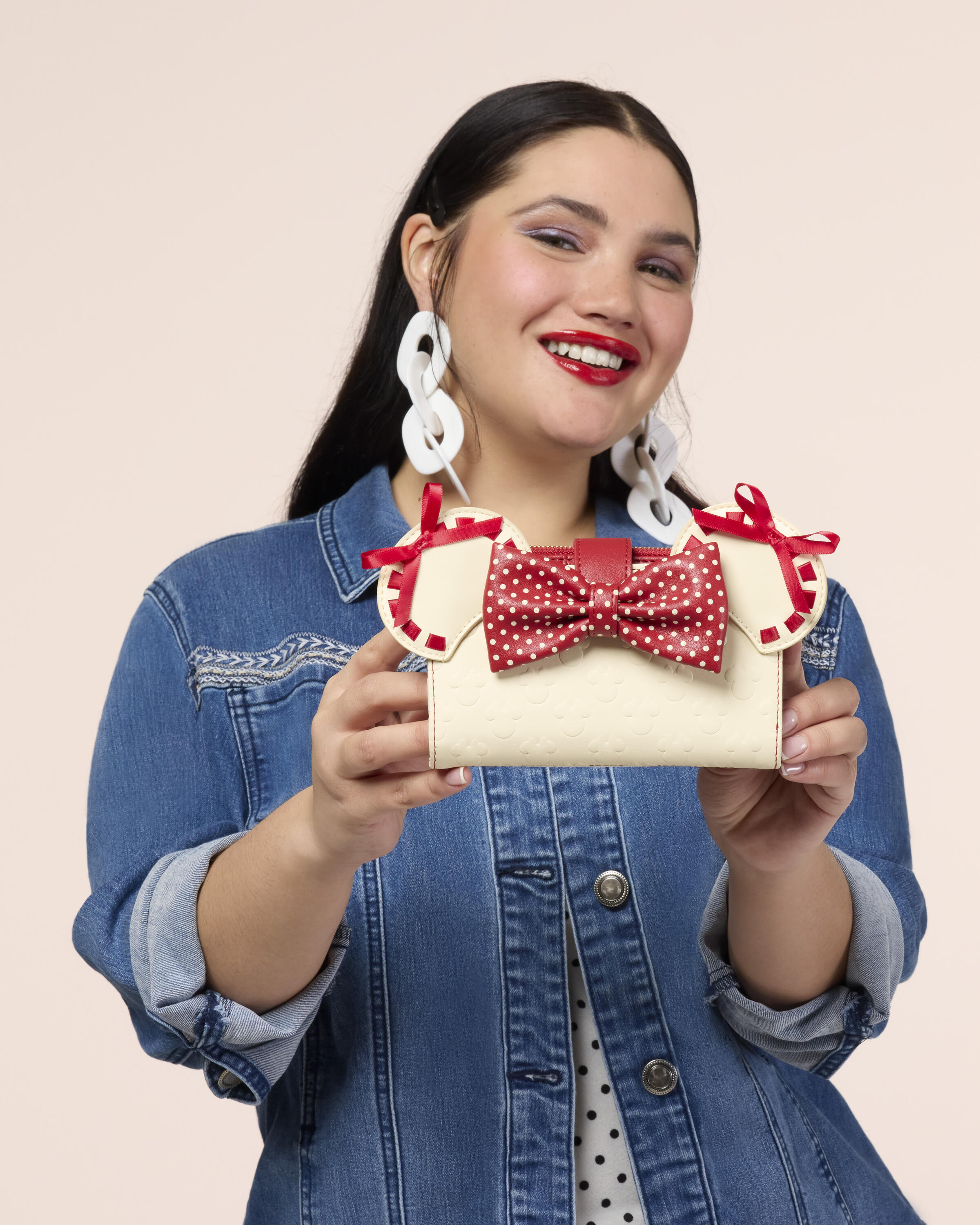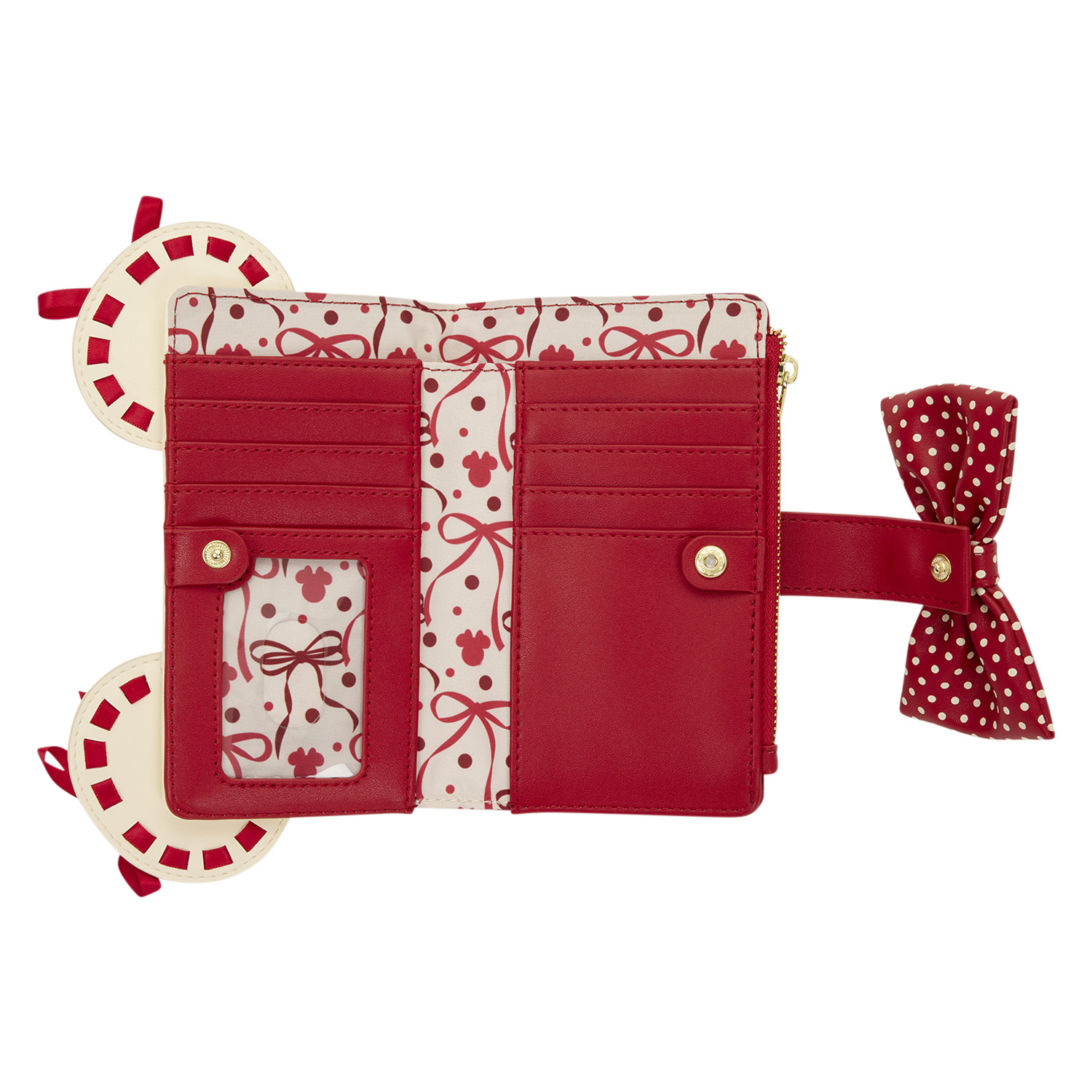 Deze portemonnee is perfect voor elke Minnie Muis fan die een vleugje Disney-magie aan zijn of haar dag wil toevoegen. Deze portemonnee is crèmekleurig en rood. Aan de voorkant vind je een reliëfpatroon van Minnie Muis silhouetten, 3D-oren, satijnen lintdetails en een strik met stippen! De achterkant van de portemonnee is rood en heeft donkerrode stippen! Binnenin vind je zeven kaartsleuven en een transparant vakje voor een identiteitskaart!