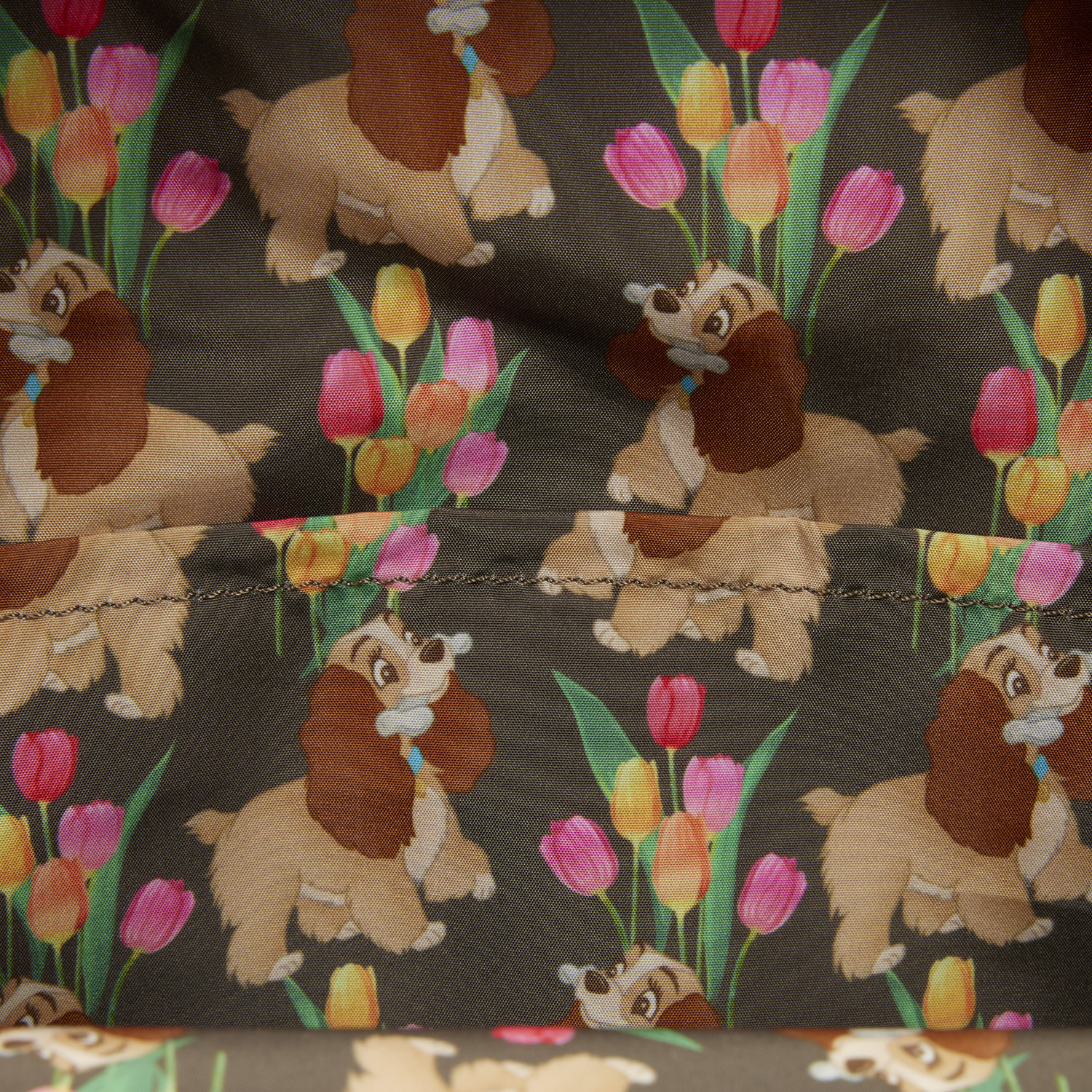 Deze mini rugzak is versierd met Lady uit Disney's "Lady and the Tramp". Op het voorvak staat ze afgebeeld met een bot in haar bek. Ze loopt door een veld vol tulpen. Op de achterkant vind je haar hondenhok met de tekst "Lady" erop.