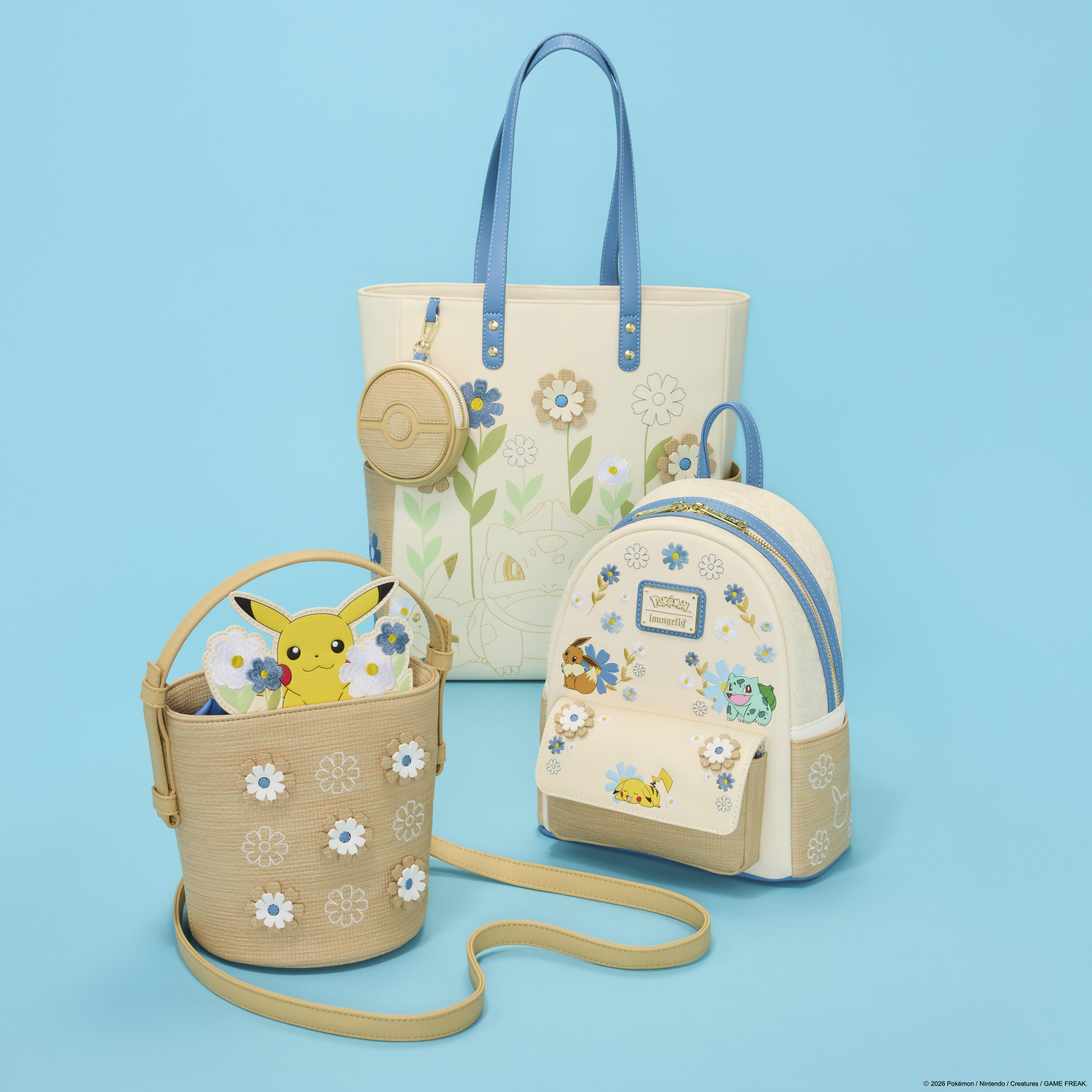 Deze totebag is versierd met de contouren van een aantal van je favoriete Pokémon: Pikachu, Bulbasaur en Eevee, omringd door bloemen. Aan de zijkanten vind je geweven details en bloemen. Aan de tas zit een afneembaar muntzakje in de vorm van een Pokébal!