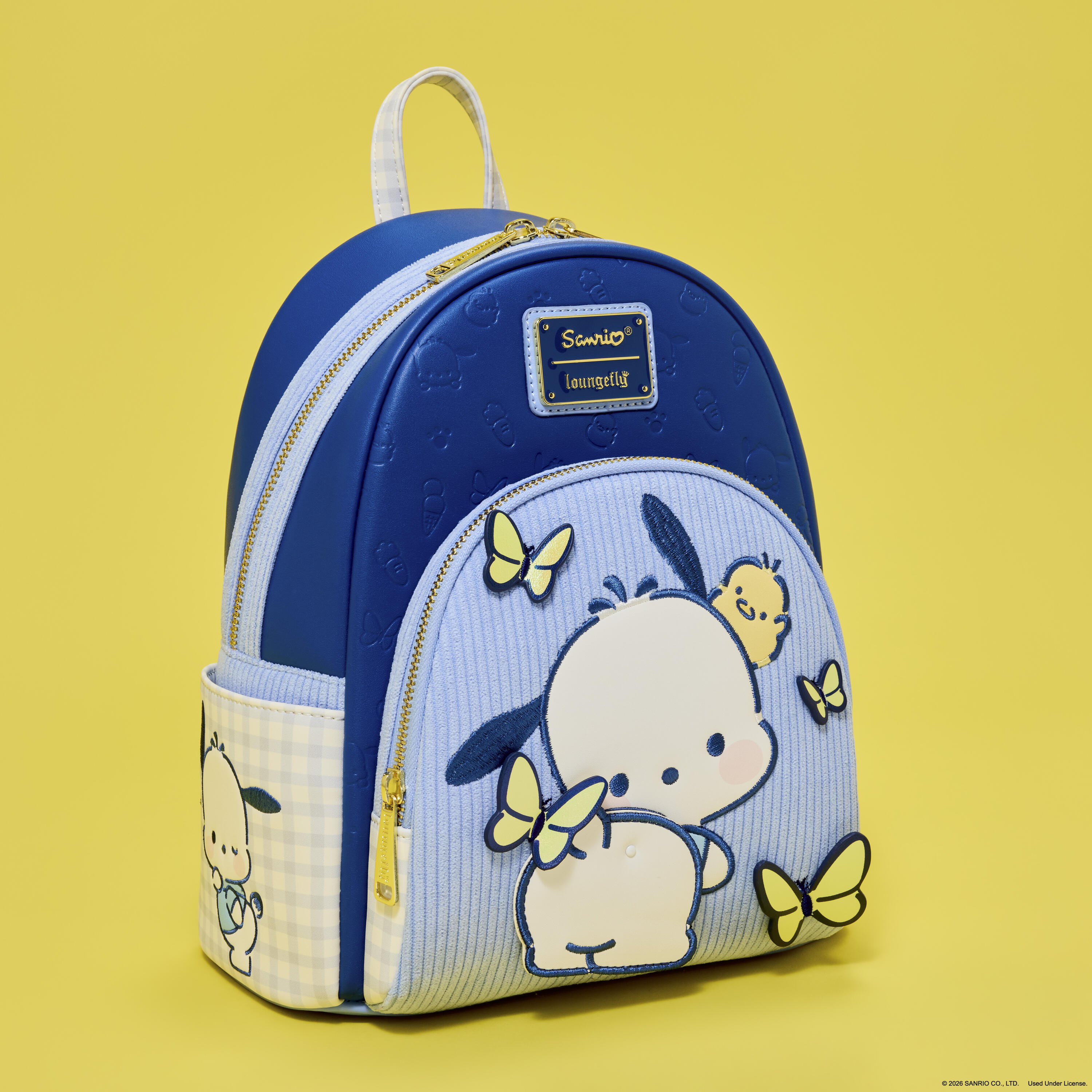 Deze schattige mini rugzak is geïnspireerd op Pochacco! Je vindt hem op de voorkant, omringd door vlinders! Hij is ook te zien op de zijvakken, waar hij er super schattig uitziet! Op de voorkant zie je Pochacco's achterkant bungelen aan een klinknagel! De zijvakken, het handvat en de schouderbanden zijn uitgevoerd in een lichtblauw-wit ruitjespatroon. Bovendien zijn er iriserende vlinderapplicaties aan de bandjes bevestigd!