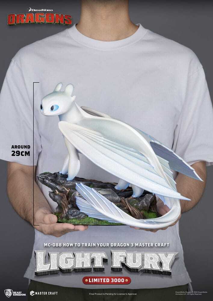 Haal de betoverende Light Fury uit Hoe tem je een draak 3 in je collectie met dit Master Craft-harsbeeldje van ongeveer 29 cm. Dit stuk legt haar elegante ontwerp, strakke vorm en mysterieuze charme perfect vast en belichaamt de magische band van de drakenwereld.