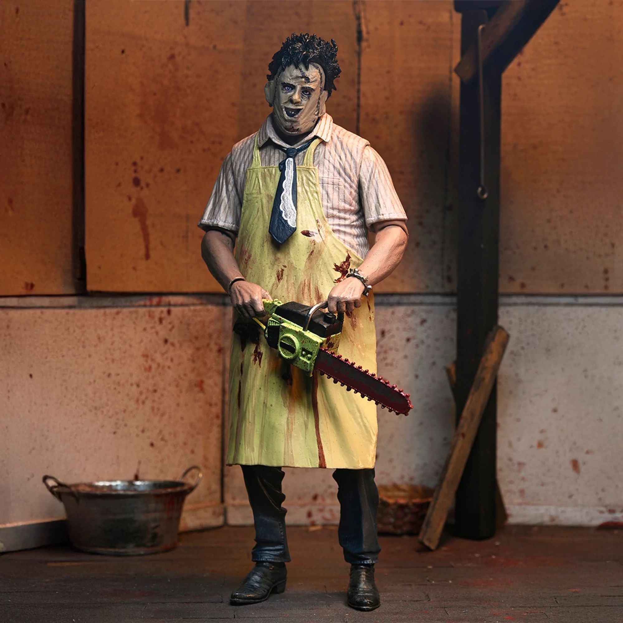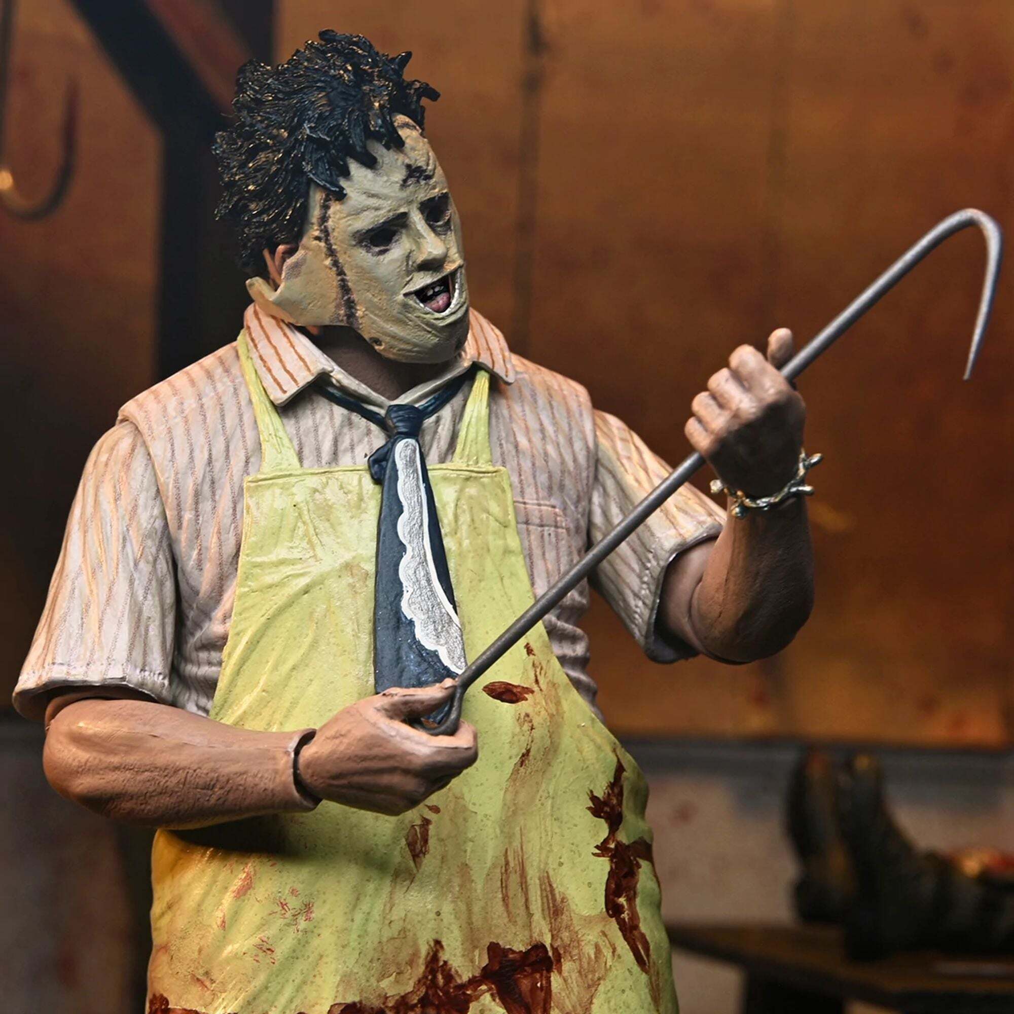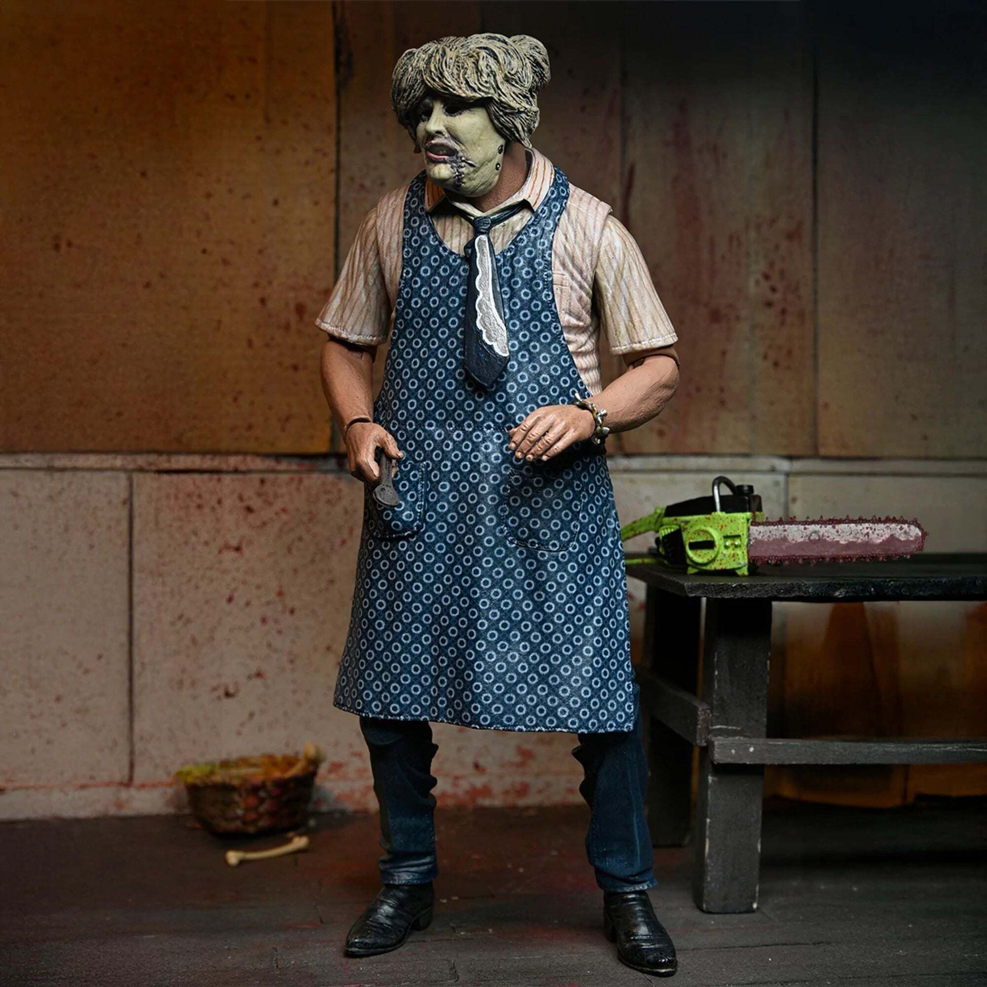 "Om de 50e verjaardag van The Texas Chainsaw Massacre te vieren, brengt NECA Leatherface terug met een gloednieuwe, volledig opnieuw ontworpen Ultimate-versie! Tobe Hoopers cultklassieker uit 1974 bracht een revolutie teweeg in de horrorfilmwereld, en dit is de perfecte gelegenheid om een stukje ervan aan je collectie toe te voegen. Deze zeer beweegbare figuur van 18 cm biedt twee stijlen dankzij de verwisselbare schorten, evenals drie hoofden en verschillende alternatieve handen. Wat accessoires betreft, is hij uitgerust met het iconische arsenaal van de Texaanse slager: een bloederige kettingzaag, hamers, tangen, mes, hakmes, slagershaak, lepel en zelfs een armband. Dit alles wordt gepresenteerd in een verzameldoos met een opening aan de voorkant. Een must-have voor Leatherface-fans... Voeg hem nu toe aan je collectie!"