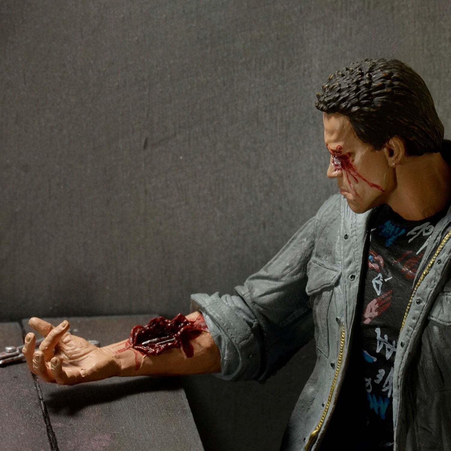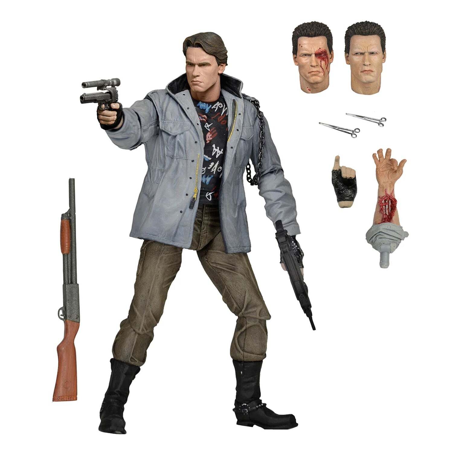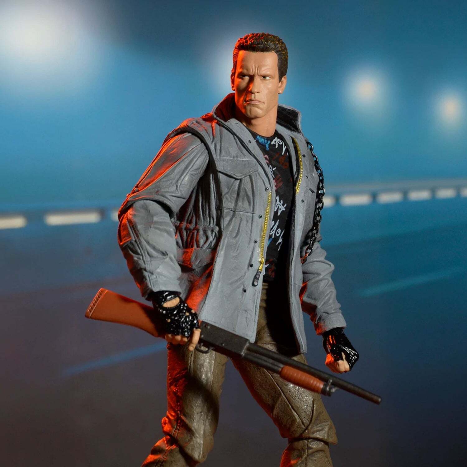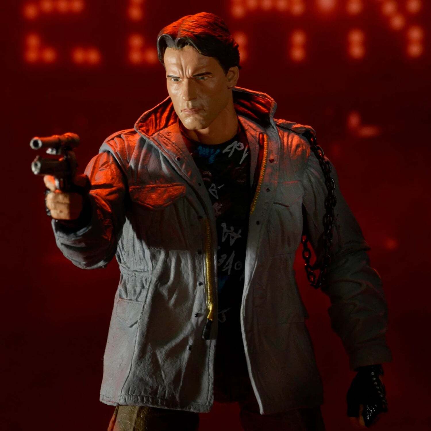 Niets zal deze vernietigingsmachine uit de toekomst stoppen, zelfs niet het ontbreken van kleding. In de film Terminator uit 1984 steelt de T-800 kleding uit die tijd van een paar onfortuinlijke punkers, waarna hij probeert Sarah Connor te vermoorden in de Tech Noir-club. Hoogte: 18 cm