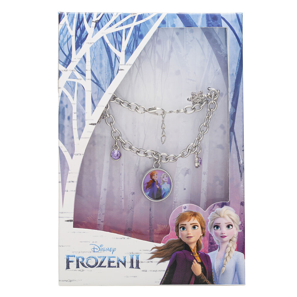 De zilveren ketting wordt aangevuld met een geëmailleerde hanger van Anna en Elsa , zilveren sneeuwvlokhangers en een bedel van paarse steen.