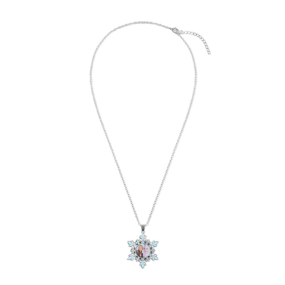 De ketting van sterlingzilver wordt gecompleteerd door het hangerontwerp van de schattige Elsa en Anna in het iconische sneeuwvlokontwerp.