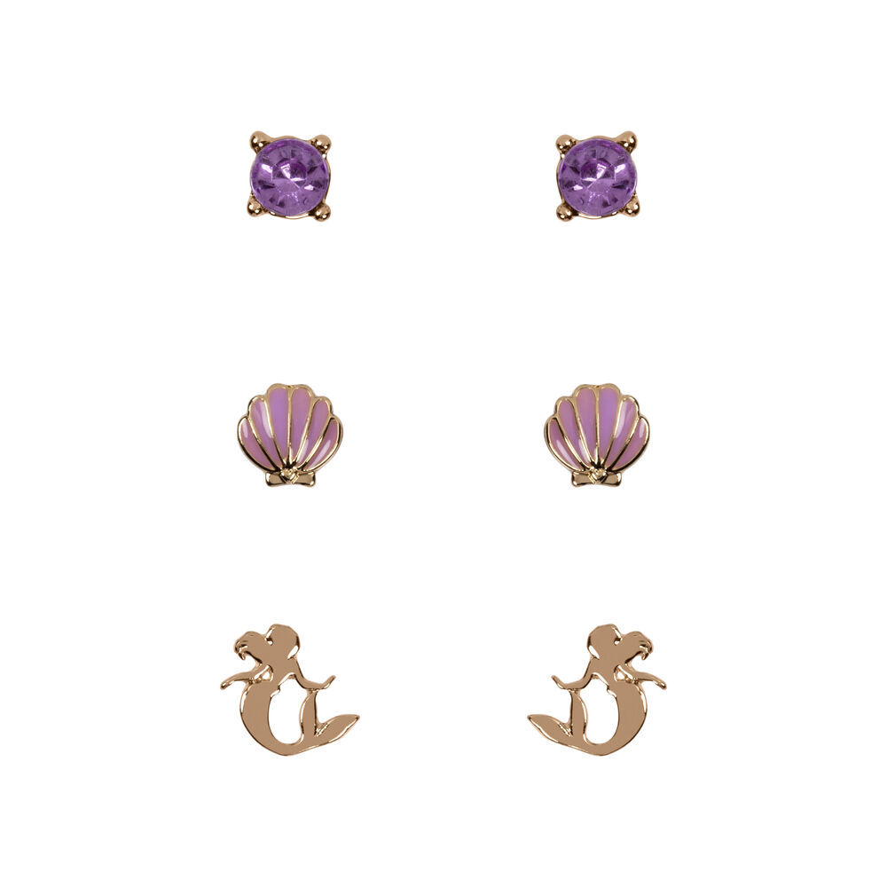 Het oorbellenpakket bevat een paar oorbellen met paarse stenen, paarse schelp en gouden Ariel ontwerp.