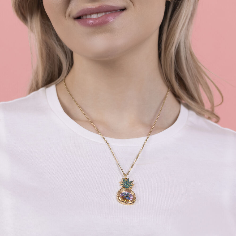 Met een gouden geëmailleerde ananashanger met zwevende stenen en gouden ketting.