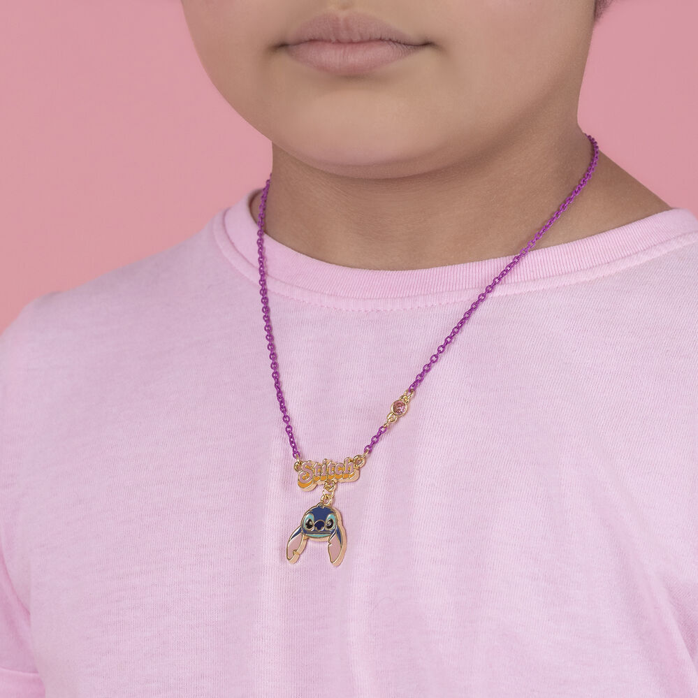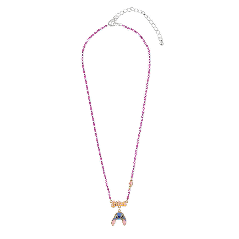 Kenmerken Stitch met een hanger in de vorm van een druppel en een paarse ketting.