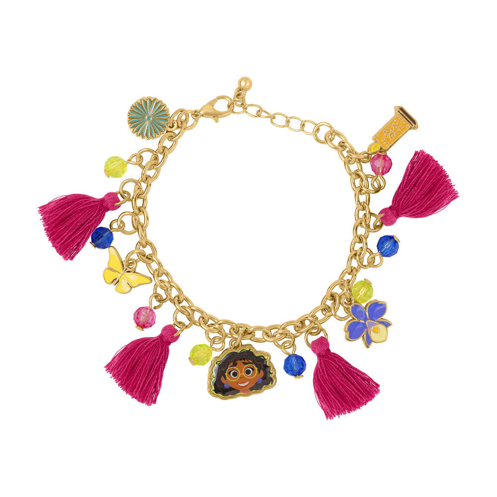 Deze gouden schakelarmband heeft roze kwastjes, vlinders en bloemen en een hanger van Mirabel zelf. Geleverd in officiële Disney-verpakking.