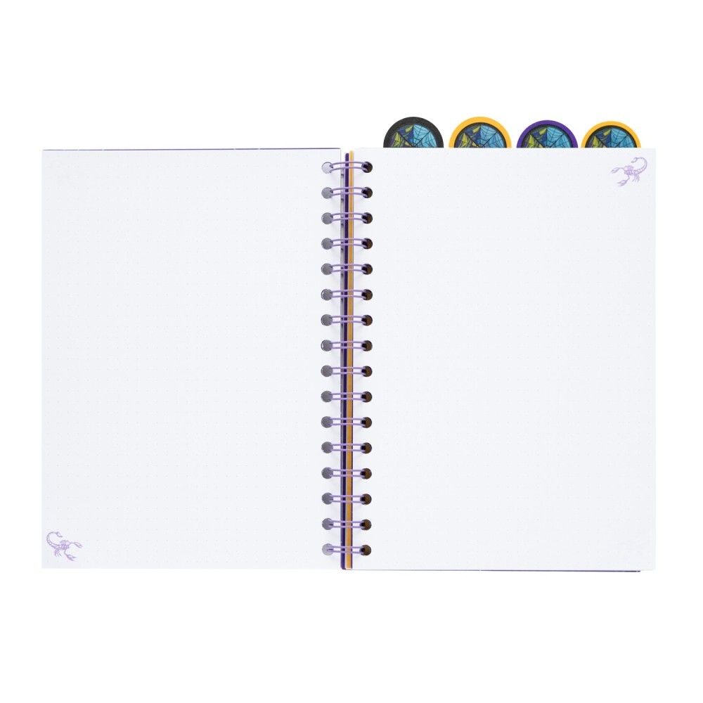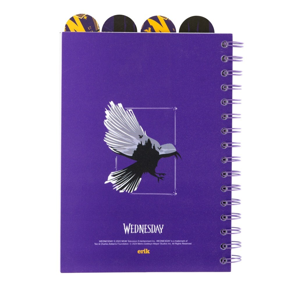 Geef je notities een vleugje gotische charme met dit Wednesday projectnotebook! Dit A5-notitieboek (14,8 x 21 cm) heeft een 0,5 mm dikke polypropyleen omslag en een spiraalbinding voor eenvoudig gebruik. Het bevat 4 polypropyleen tabbladen met bovenste tabjes en 80 vellen (160 pagina’s) van 80 g/m² papier, elk blad gepersonaliseerd met Wednesday-designs. Perfect om ideeën, schetsen of plannen in echte Addams Family-stijl op te schrijven.