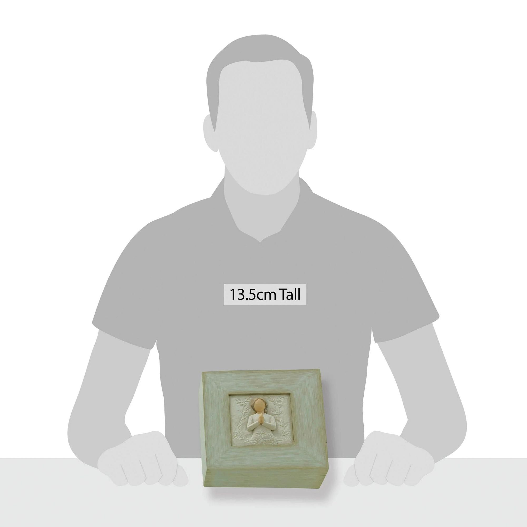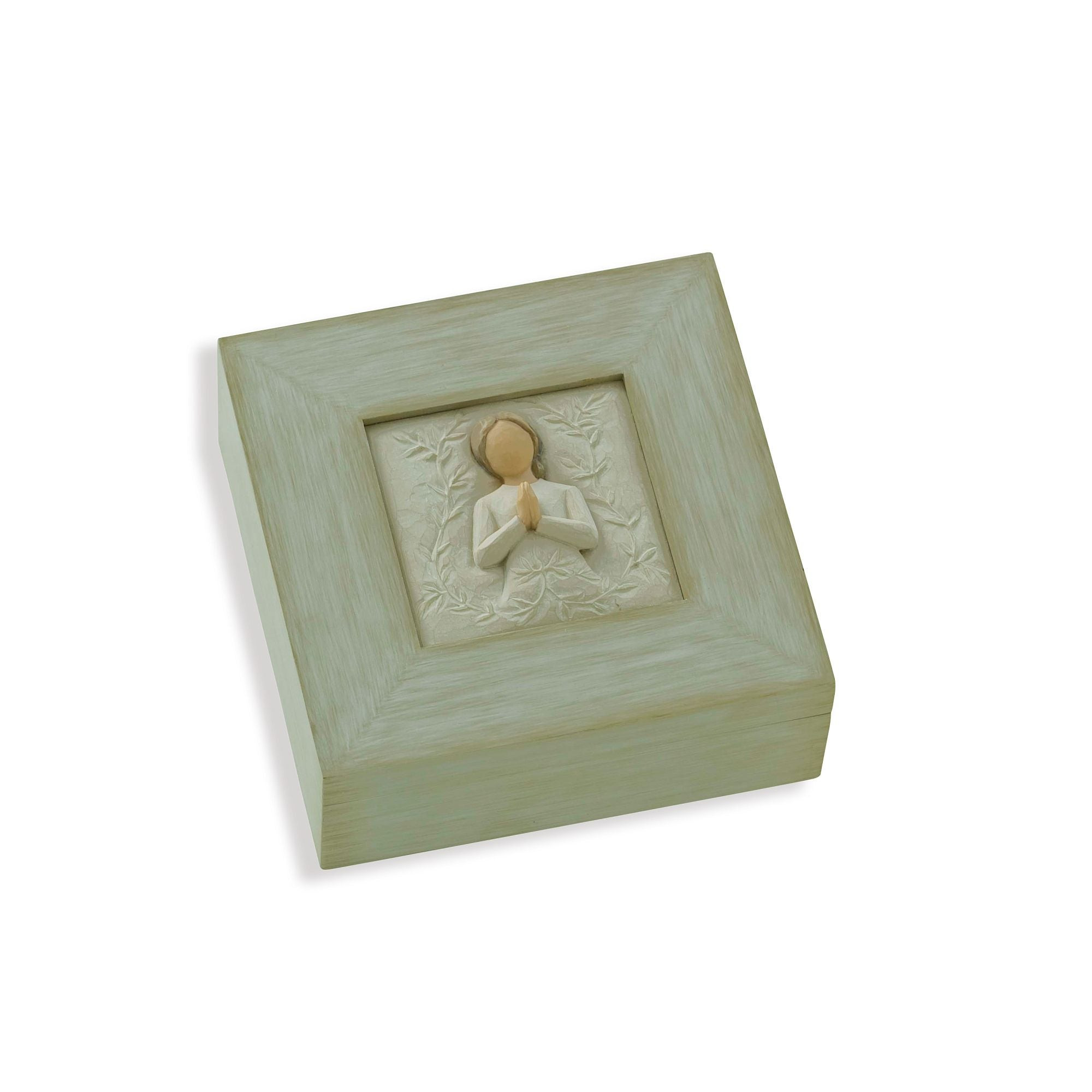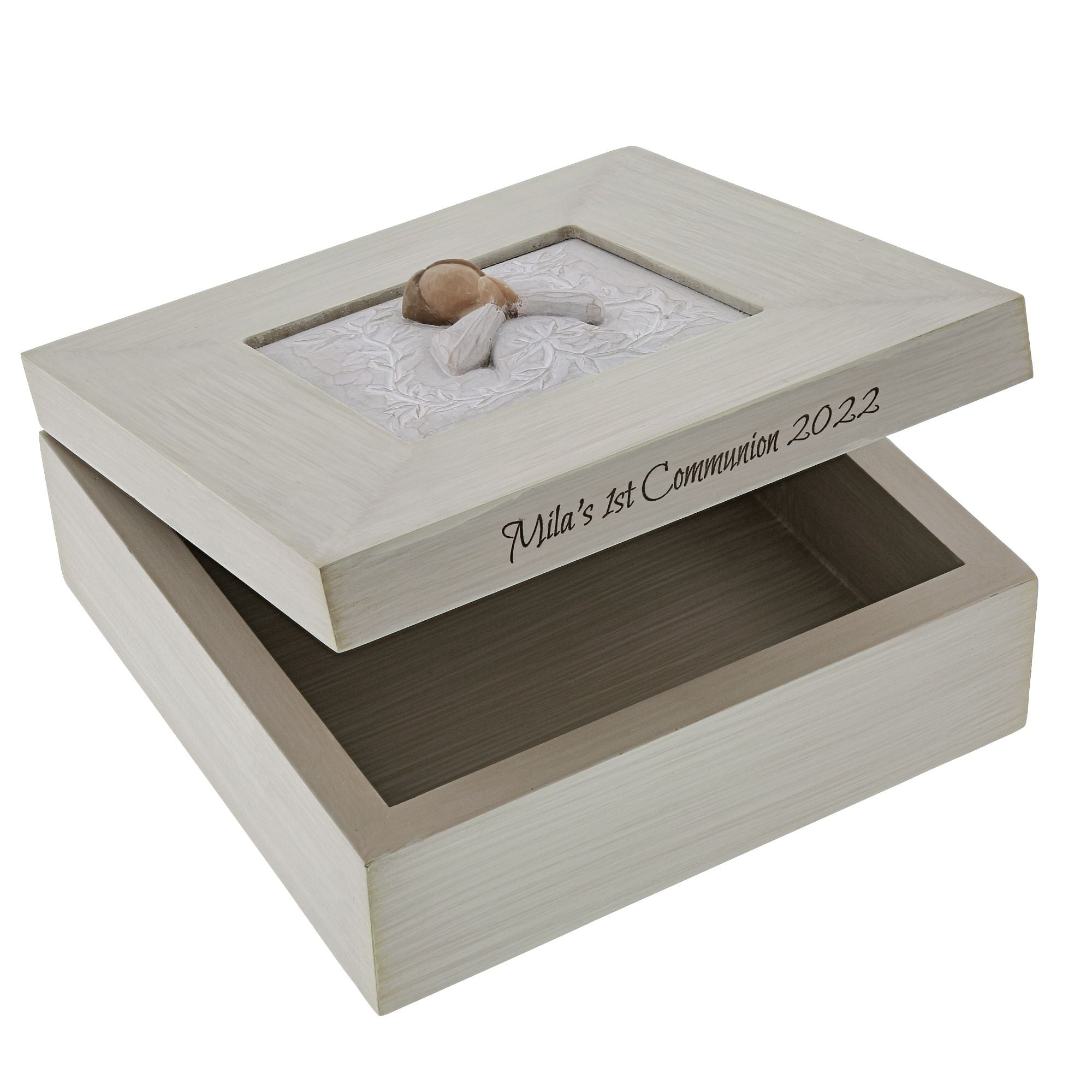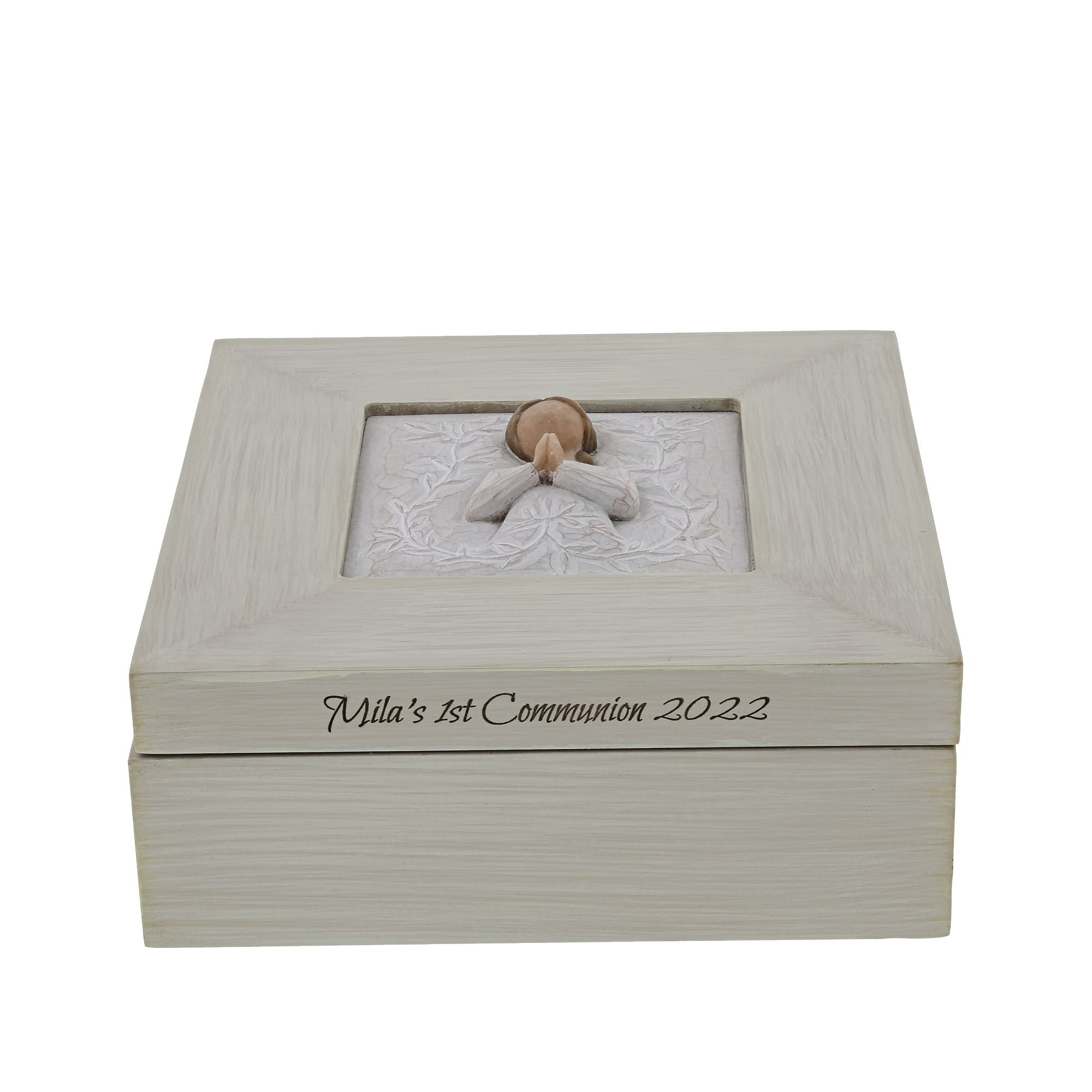 Een fijn vervaardigde doos van hars en hout met een scharnierend deksel, ideaal voor het bewaren van elk kostbaar item met sentimentele waarde. Een geschenk om troost en hoop te brengen. Om spirituele mijlpalen te vieren, zoals de doop, de eerste communie en het vormsel.